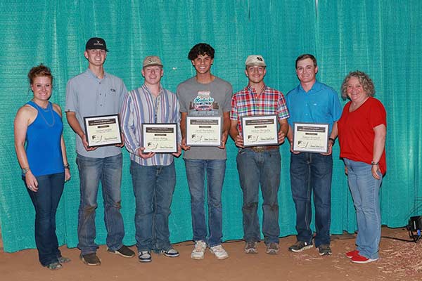 From left are Emma Collins Powell, American Angus Auxiliary president elect, presenting; Samual Jordan, Savannah, Mo., first; Bryce Hofing, Coatesville, Ind., second; Jacob Marksbury, Buffalo, Ky., third; Jackson McCurry, Colwich, Kan., fourth; Dalton Birdwell, Bryson, Texas, fifth; and Tonya Theis, American Angus Auxiliary president, presenting.