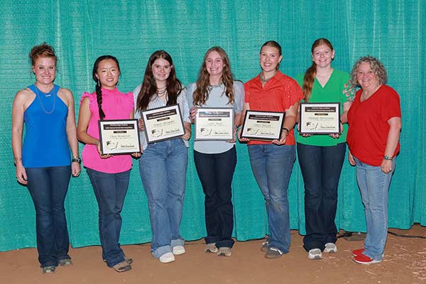 From left are Emma Collins Powell, American Angus Auxiliary president elect, presenting; Clara Henderson, East Troy, Wis., first; Payton Alexander, Nemo, Texas, second; Cailee Flood, Oakdale, Calif., third; Claire Murnin, Pompeys Pillar, Mont., fourth; Addie Havercamp, Bern, Kan., fifth; and Tonya Theis, American Angus Auxiliary president, presenting.
