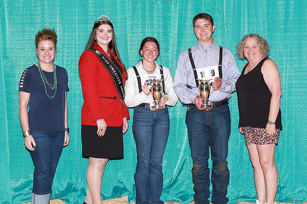 Alli Perry, Fayetteville, Tenn., won the Girl’s Silver Pitcher Award; and Suter Clark, Gretna, Va., won the Boy’s Silver Pitcher Award. Pictured (from left) are Emma Collins Powell, American Angus Auxiliary president elect, and Rosalind Kidwell, Miss American Angus, both presenting; Perry and Clark, recipients; and Tonya Theis, American Angus Auxiliary president, presenting.